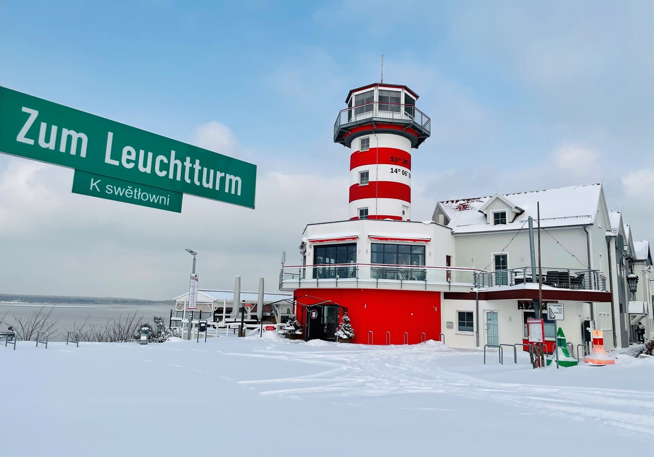 Geierswalder See mit Leuchtturm-Hotel im Winter, Foto: Kathrin Winkler