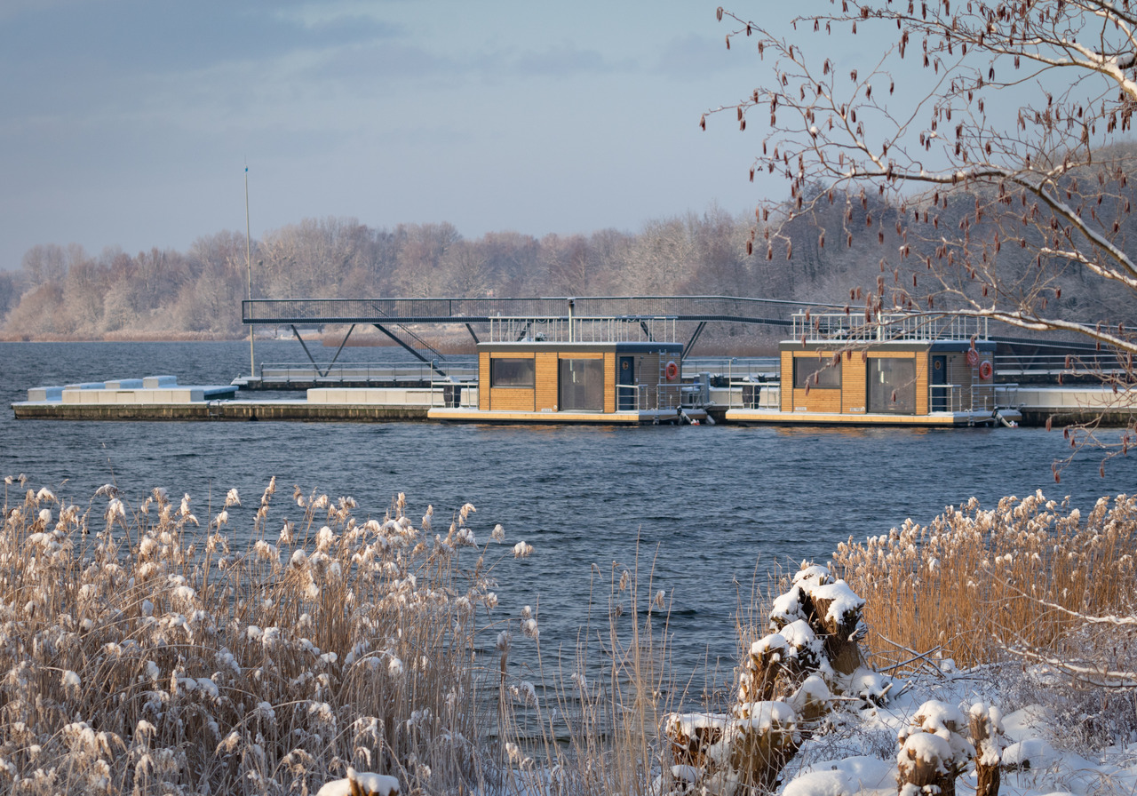Saunaflöße am Senftenberger Stadthafen im Winter, Foto: Kathrin Winkler