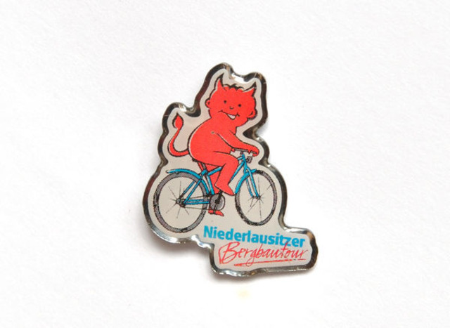 Der radelnde Rekord-Teufel - das Logo der Niederlausitzer Bergbautour - hier als Ansteckpin.
