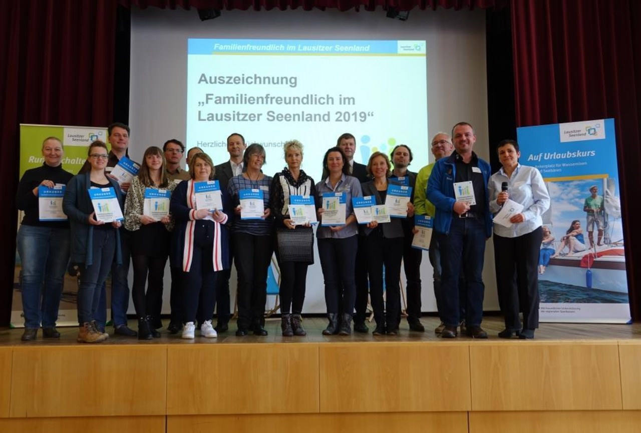 Erstmals wurden zum 2. Tourismustag Lausitzer Seenland am 26. März 2019 in Großräschen 16 familienfreundliche Betriebe ausgezeichnet. Sie punkten mit passender Qualität und Service für den Familienurlaub im Lausitzer Seenland. Die Übergabe der Urkunden und Plaketten erfolgte durch Siegurd Heinze, stellvertretender Vorstandsvorsitzender des Tourismusverbandes Lausitzer Seenland e.V. und Landrat des Landkreises Oberspreewald-Lausitz, und Marcus Heberle, stellvertretender Verbandsgeschäftsführer und zuständig für die Produktentwicklung Familienurlaub.