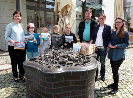 Präsentation der Rätseltour durch Senftenberg am Stadtmodell auf dem Marktplatz mit Senftenberger Grundschülern der 3. Klasse, die den Familienrundgang vorab getestet hatten.