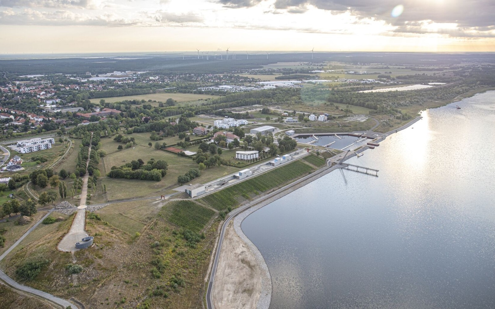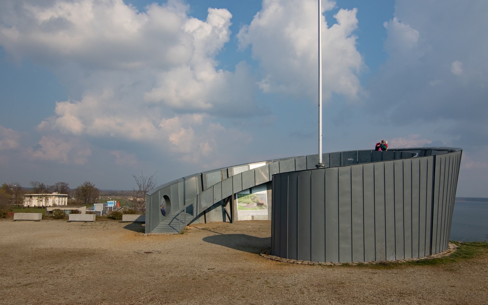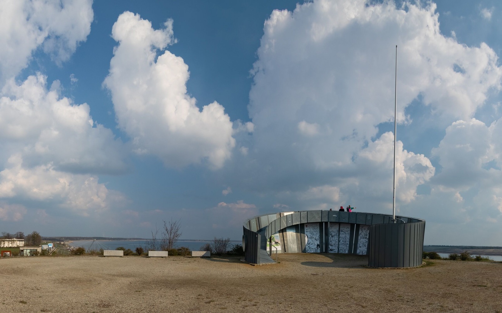 The Victoriahöhe viewpoint provides a panoramic view of Lake Großräschener, the IBA Terraces, pier, vineyard, Großräschen harbour and the Avenue of Stones. The Victoriahöhe viewpoint is a heap created from dumped material from the former Meuro surface mine on the site of the former Victoria I briquette factory. The small hill is crowned by a steel viewing platform, designed to look like a ship, about 138 metres above sea level. Information panels explain what can be seen in the distance and remind visitors of villages that have disappeared into the surface mining pit. On a clear day, you might even be able to see the stand of the Lausitzring race track and the power stations at Schwarze Pumpe and Jänschwalde. The striking viewpoint is adorned from the inside with illustrations from the campaign "From Miner to Mariner". They show new harbours, conveyor bridges, floating houses, mining equipment, lighthouses, miners, ships and vacationers, cyclists, bathers or boaters.
