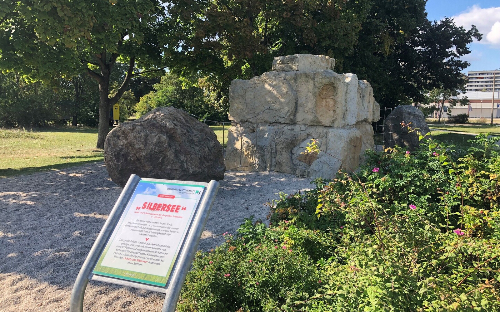Another area features a climbing tower with a long, enclosed tube slide. The tower is accessible via net elements and has an appealing color scheme. Within sight of this is a small climbing rock with several large natural stones and an information board entitled “Silbersee” (Silver Lake), which refers to a playful theme.