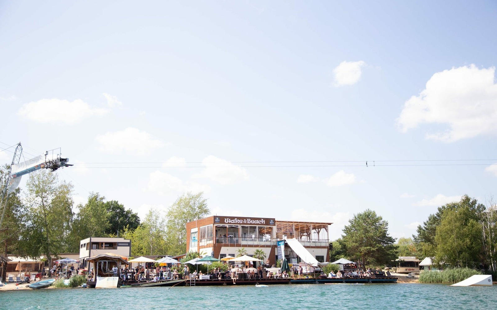 Pohled na areál vodních lyží a wakeboardů Wake and Beach Halbendorf s restaurací, snack barem, střešní terasou atd., Foto: Wake and Beach Halbendorf, Lizenz: Wake and Beach Halbendorf