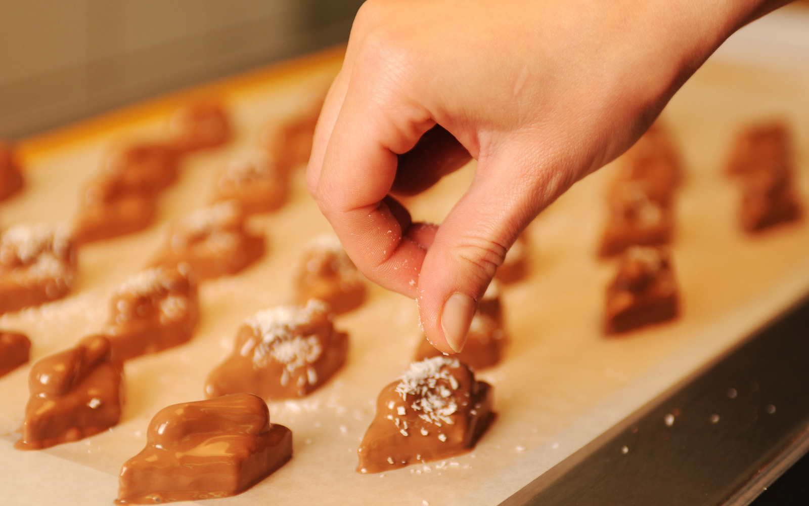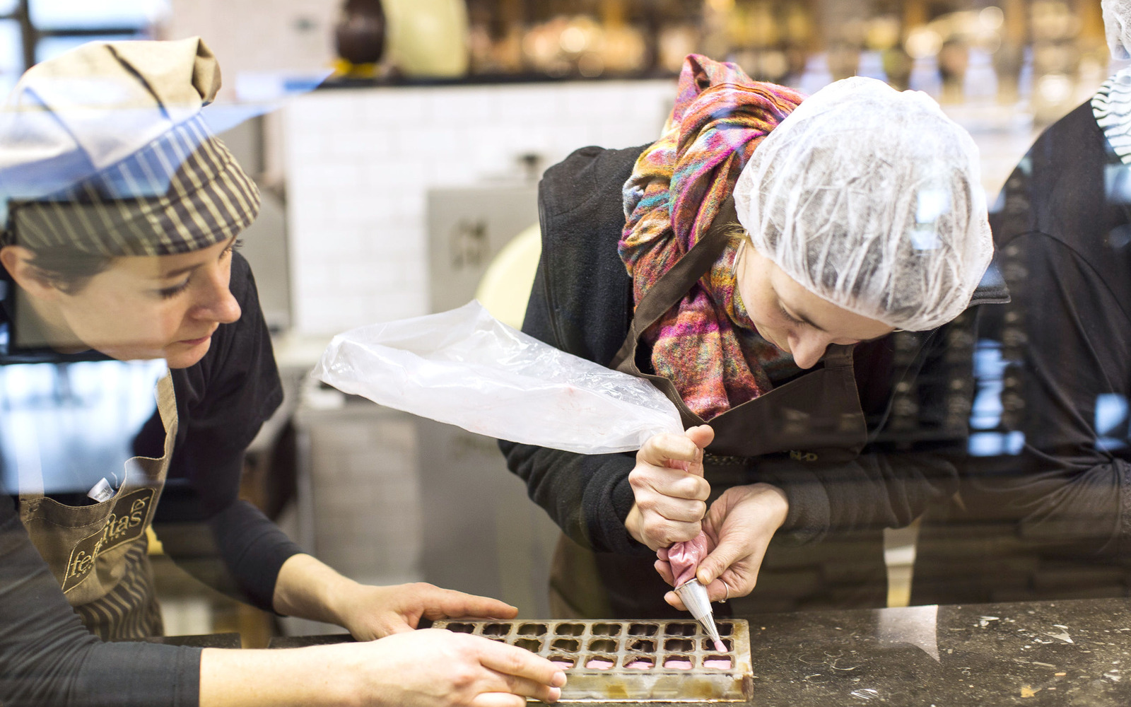 In der Mitmach-Schauwerkstatt kann man sich beim Erlebnis Schokomalerei gleich selbst als Chocolatier probieren. Neben den Pralinenseminaren werden interessante Führungen angeboten.