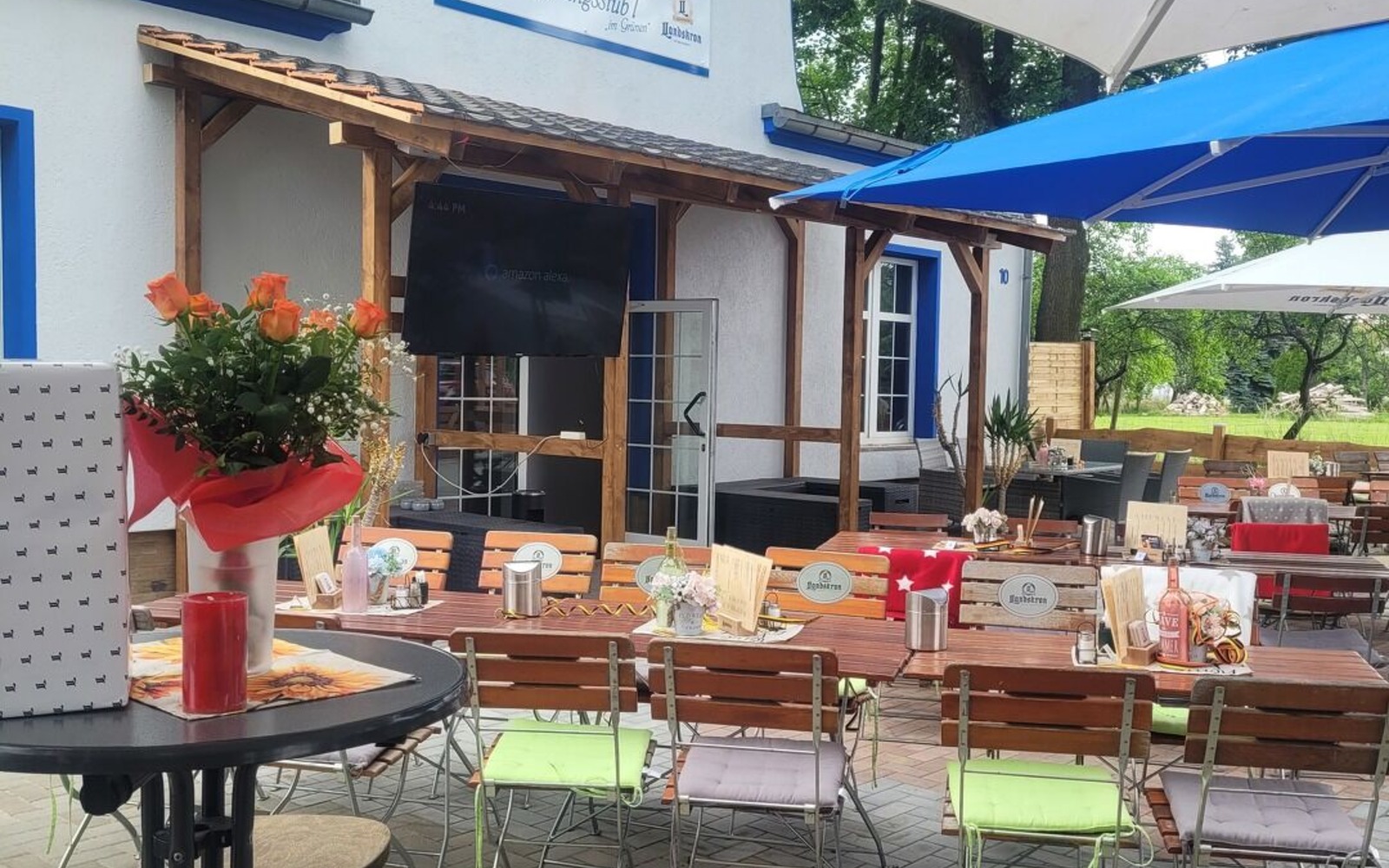 Der großzügige Biergarten unter schattigen Bäumen lädt besonders an warmen Tagen zum Verweilen ein. Das Restaurant ist kinderfreundlich, Hunde sind willkommen. Dartspiele sind gegen Aufpreis möglich.