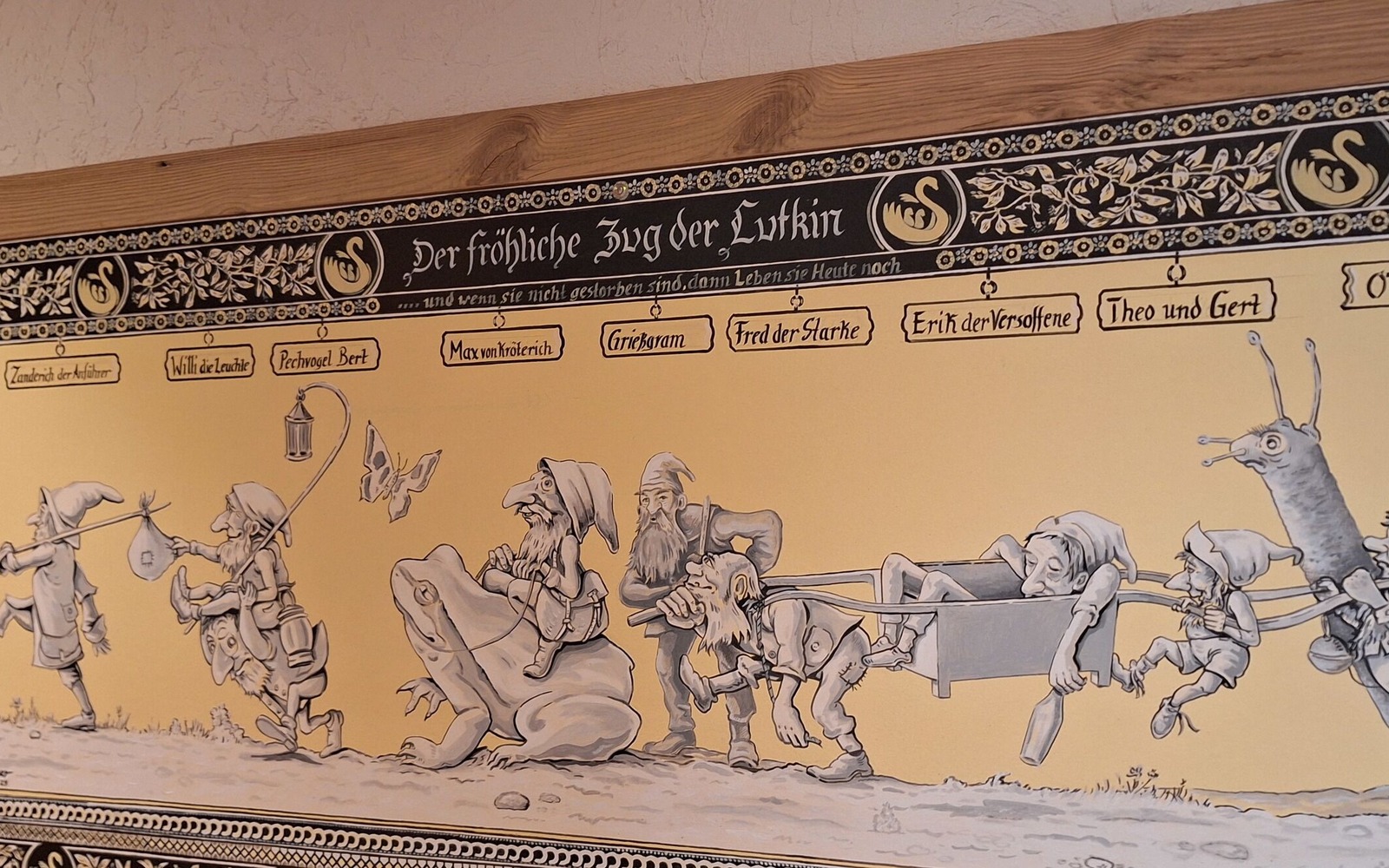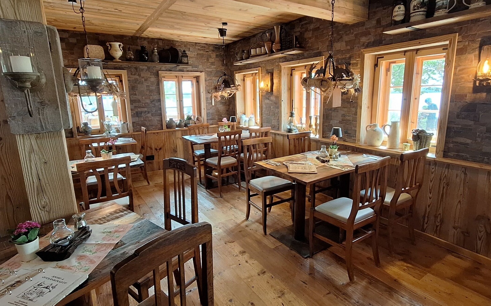 In der Lutki-Hütte finden bis zu 50 Gäste in einem ebenerdigen Gastbereich und einer kleinen Galerie auf der Empore gemütlich Platz.