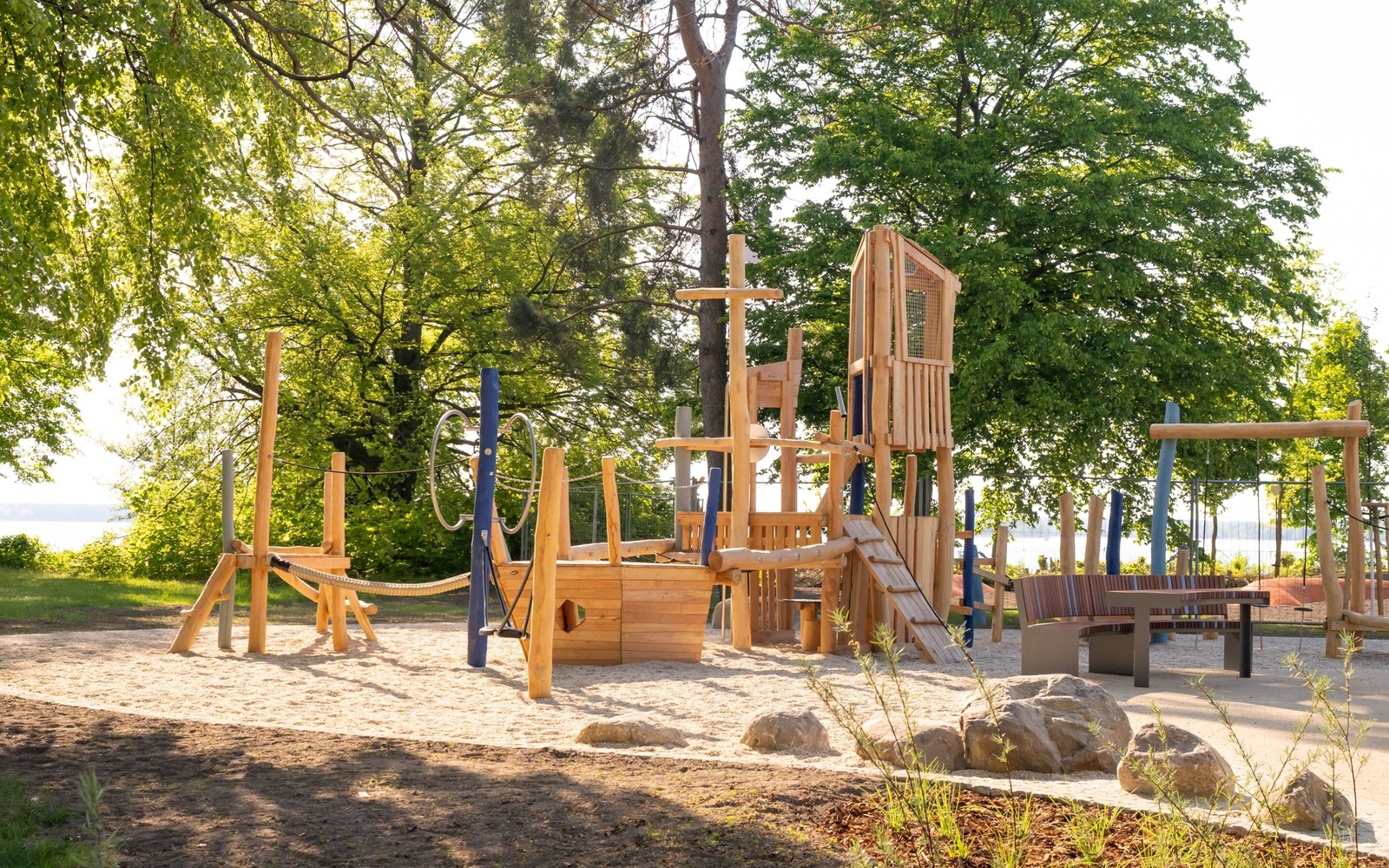 Direkt am Uferweg nahe des Gaumensegels bietet der neugestaltete Themenspielplatz in Senftenberg vielfältige Spielmöglichkeiten mit maritimen und bergbaulichen Bezügen. Im Mittelpunkt steht das bekannte Spielschiff „Bounty“, das neu aufgearbeitet und farblich überarbeitet in die Anlage integriert wurde. Eine ergänzende Flotte, neue Kletterelemente wie Holzfässer sowie eine Seilbahn mit Seeblick erweitern das Angebot. Kleine Hügel symbolisieren Abraumhalden und schlagen thematisch den Bogen vom ehemaligen Tagebau zum heutigen Seenland. Der bestehende Rapunzelturm mit Rutsche bleibt ebenso erhalten wie der benachbarte Rodelhügel. Der Spielplatz verfügt über einen integrativen Bereich und ist durch barrierearme Wege auch mit Kinderwagen oder Rollstuhl gut zugänglich. Mehrere große Findlinge erinnern an Dr. Otto Rindt, einen der maßgeblichen Gestalter des Lausitzer Seenlandes. Der nächste Badestrand liegt nur wenige hundert Meter entfernt östlich des Spielplatzes.