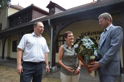 Bildunterschrift: Siegurd Heinze, Landrat des Landkreises Oberspreewald-Lausitz und stellvertretender Vorstandsvorsitzender des Tourismusverbandes Lausitzer Seenland e.V. war einer der ersten Gratulanten am neuen Geschäftssitz und wurde von Kathrin Winkler, Verbandsgeschäftsführerin (Mitte) und Marcus Heberle (links), stellvertretender Geschäftsführer in den neuen Räumlichkeiten empfangen.