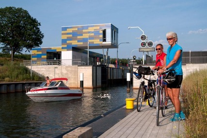 Radfahrer an Schleuse im schiffbaren Koschener Kanal