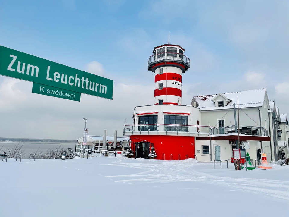 Foto Geierswalder See mit Leuchtturm-Hotel im Winter(c) Tourismusverband Lausitzer Seenland, Kathrin Winkler (JPG; 9,54 MB)