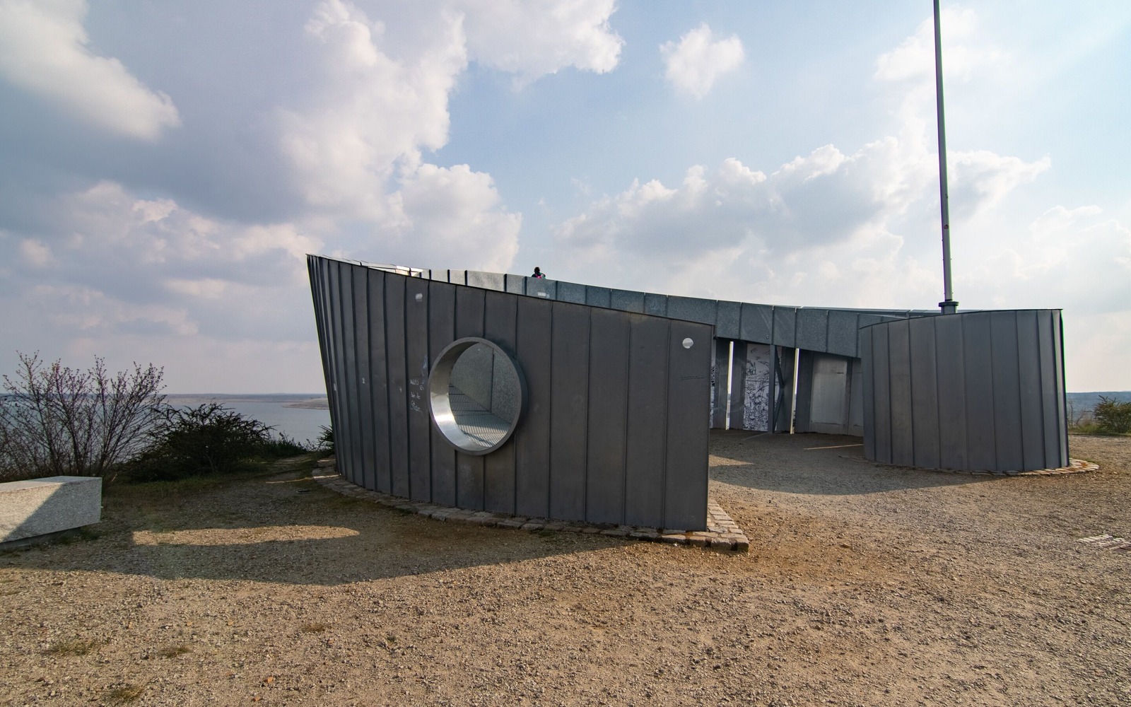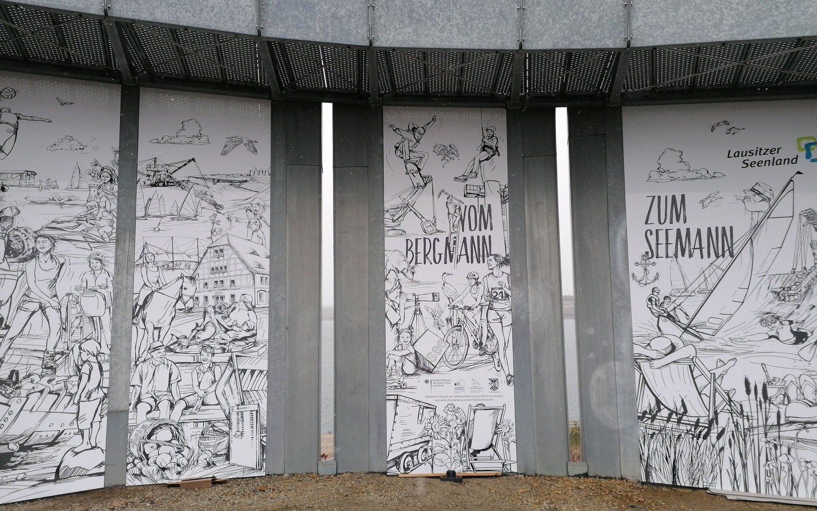 The Victoriahöhe viewpoint provides a panoramic view of Lake Großräschener, the IBA Terraces, pier, vineyard, Großräschen harbour and the Avenue of Stones. The Victoriahöhe viewpoint is a heap created from dumped material from the former Meuro surface mine on the site of the former Victoria I briquette factory. The small hill is crowned by a steel viewing platform, designed to look like a ship, about 138 metres above sea level. Information panels explain what can be seen in the distance and remind visitors of villages that have disappeared into the surface mining pit. On a clear day, you might even be able to see the stand of the Lausitzring race track and the power stations at Schwarze Pumpe and Jänschwalde. The striking viewpoint is adorned from the inside with illustrations from the campaign "From Miner to Mariner". They show new harbours, conveyor bridges, floating houses, mining equipment, lighthouses, miners, ships and vacationers, cyclists, bathers or boaters.
